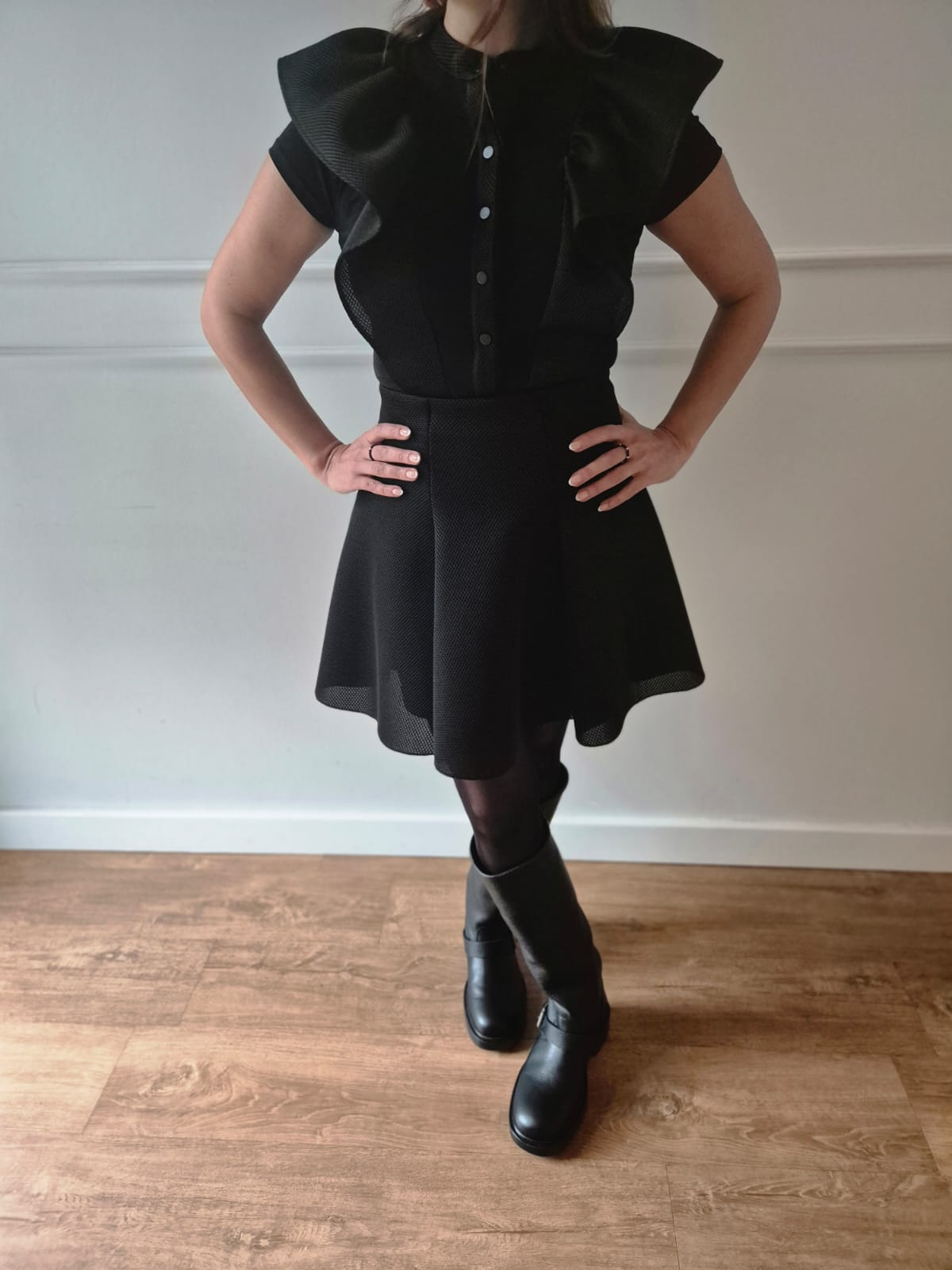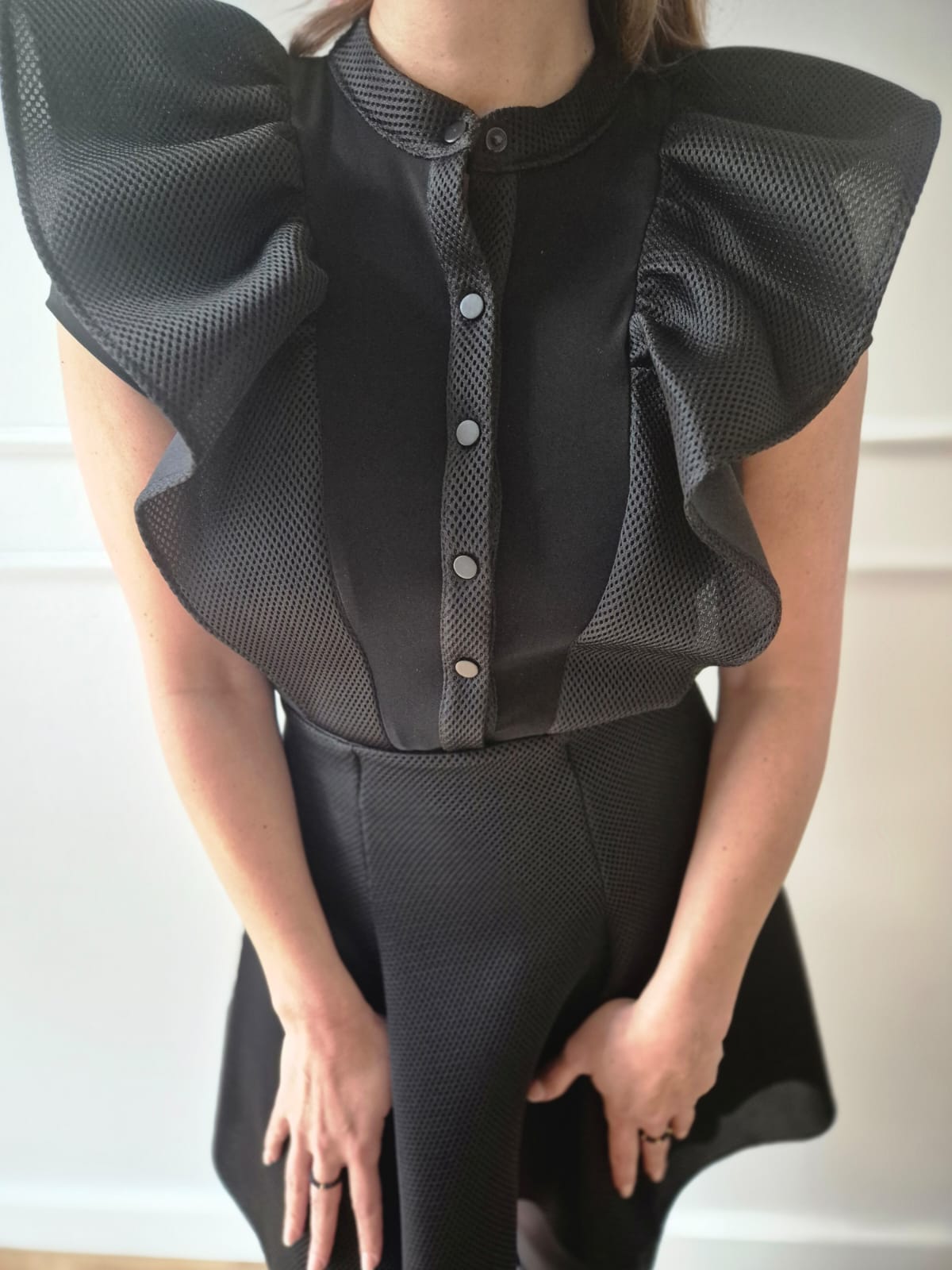 Eleganter schwarzer Body mit Volants und Druckknöpfen