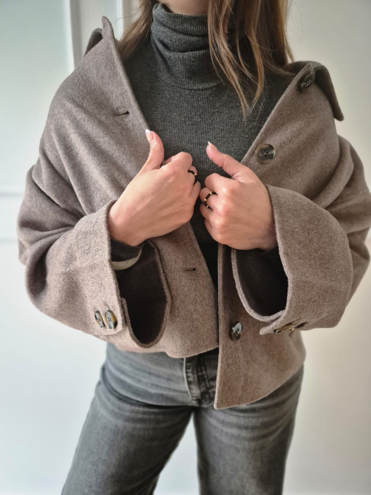Kurzer ausgestellter Mantel aus handgenähter Wollmischung