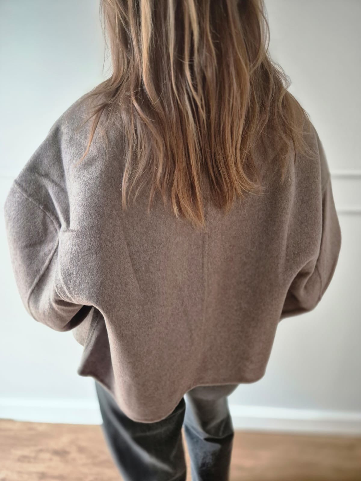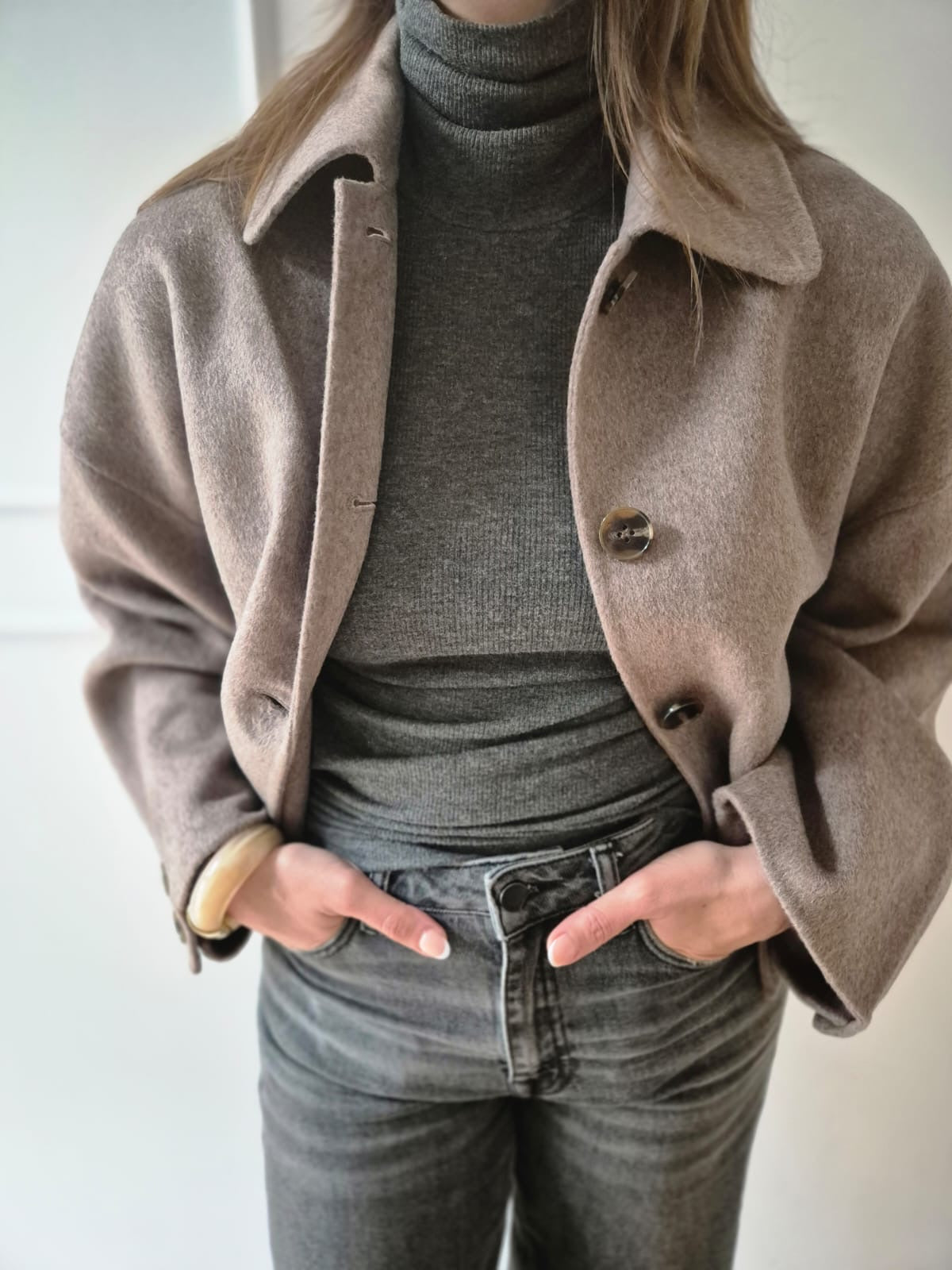 Kurzmantel aus handgenähtem Wollmix. Lockere, strukturierte Passform. Fünf kontrastierende Knöpfe. Klassischer Hemdkragen. Leicht ausgestellte lange Ärmel. Dezente Seitentaschen. Warmes, weiches Material. Eleganter, zeitloser Stil.