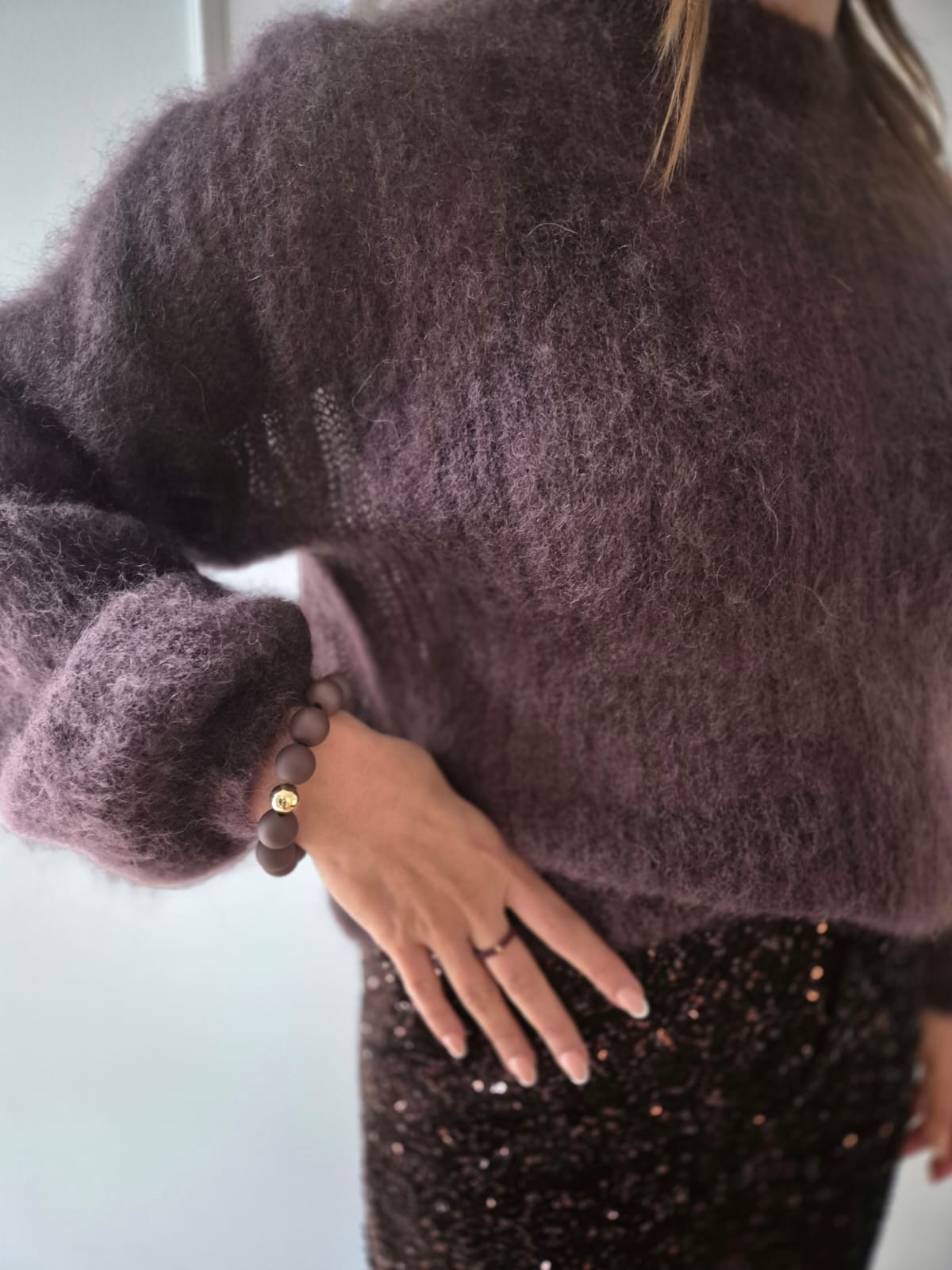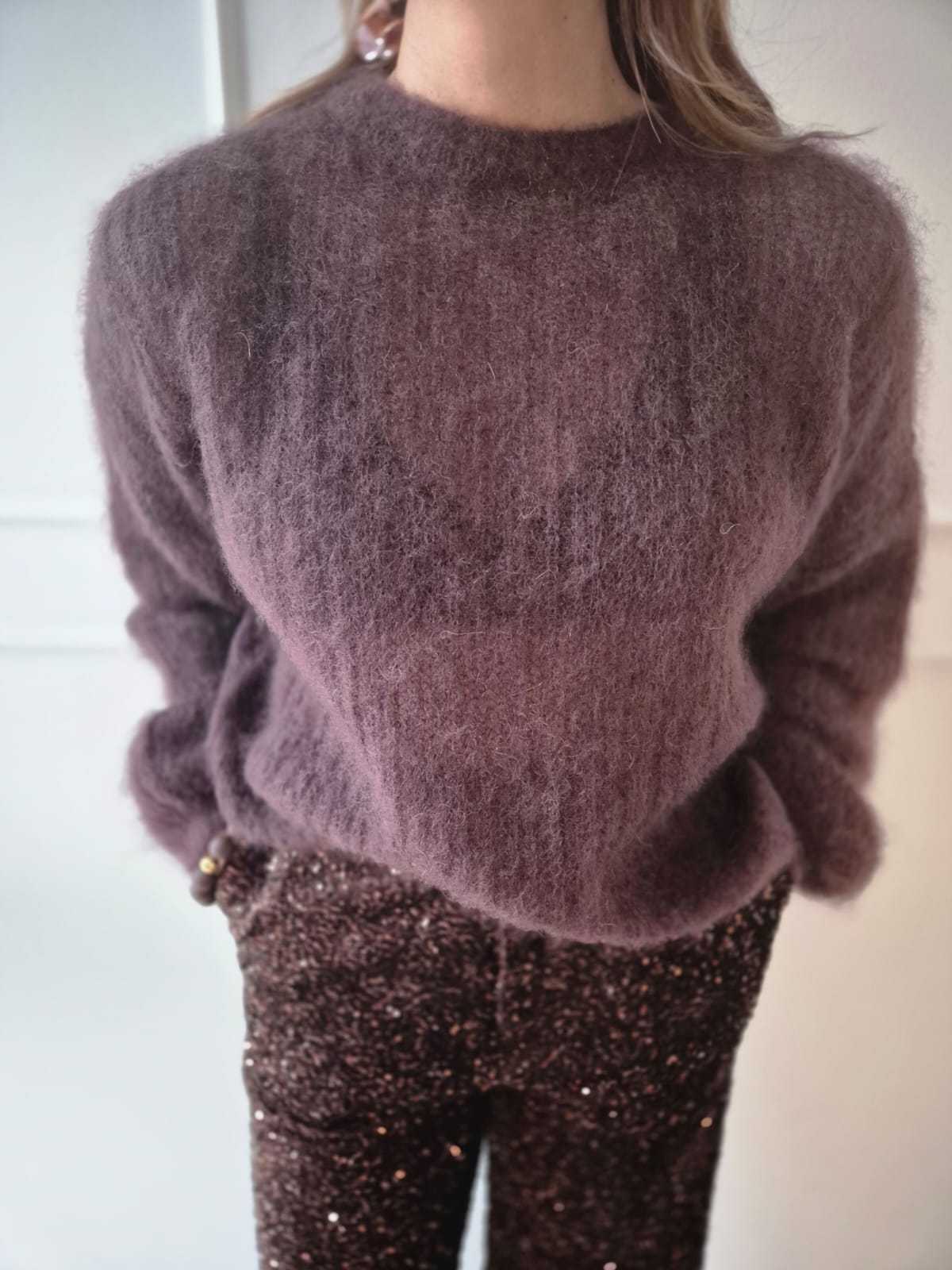 Ein wunderschöner Pullover aus 80 % Kid Mohair, zart, kuschelig und leicht transparent. Die edle Farbe Aubergineverleiht ihm eine besondere Tiefe und Eleganz. Perfekt für die festlichen Tage – besonders harmonisch kombiniert mit unserer neuen Paillettenhose. Ein Look, der luxuriös wirkt und sich dennoch angenehm leicht trägt.